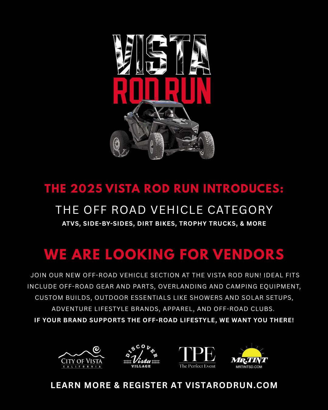 Register early for the best price! Interested in being a vendor? Join the new Off-Road vendor vehicle section, if your brand supports the off-road lifestyle! Sponsorship packages are also available.